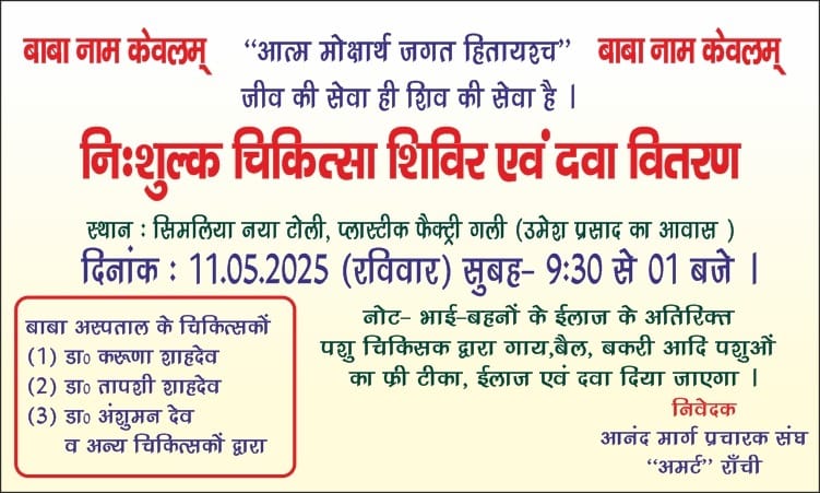 निःशुल्क चिकित्सा शिविर व दवा वितरण कार्यक्रम 11 मई को विनीत कुमार,राँची (झारखंड)। ग्रामीण क्षेत्र सिमलिया नया टोली (प्लास्टिक फैक्ट्री…