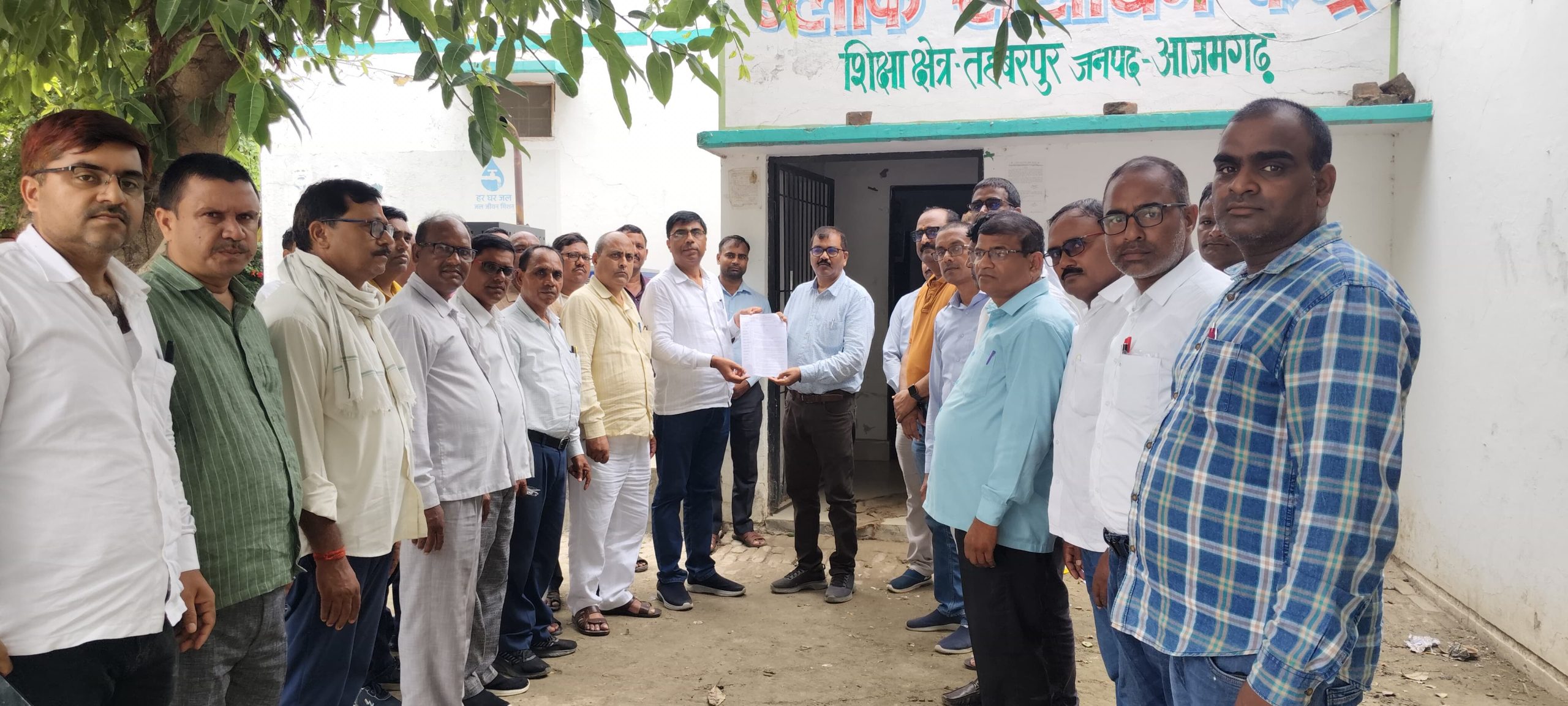 तहबरपुर में शिक्षको ने विद्यालयो के विलय के विरोध में खण्ड शिक्षा अधिकारी को सौंपा ज्ञापन ।