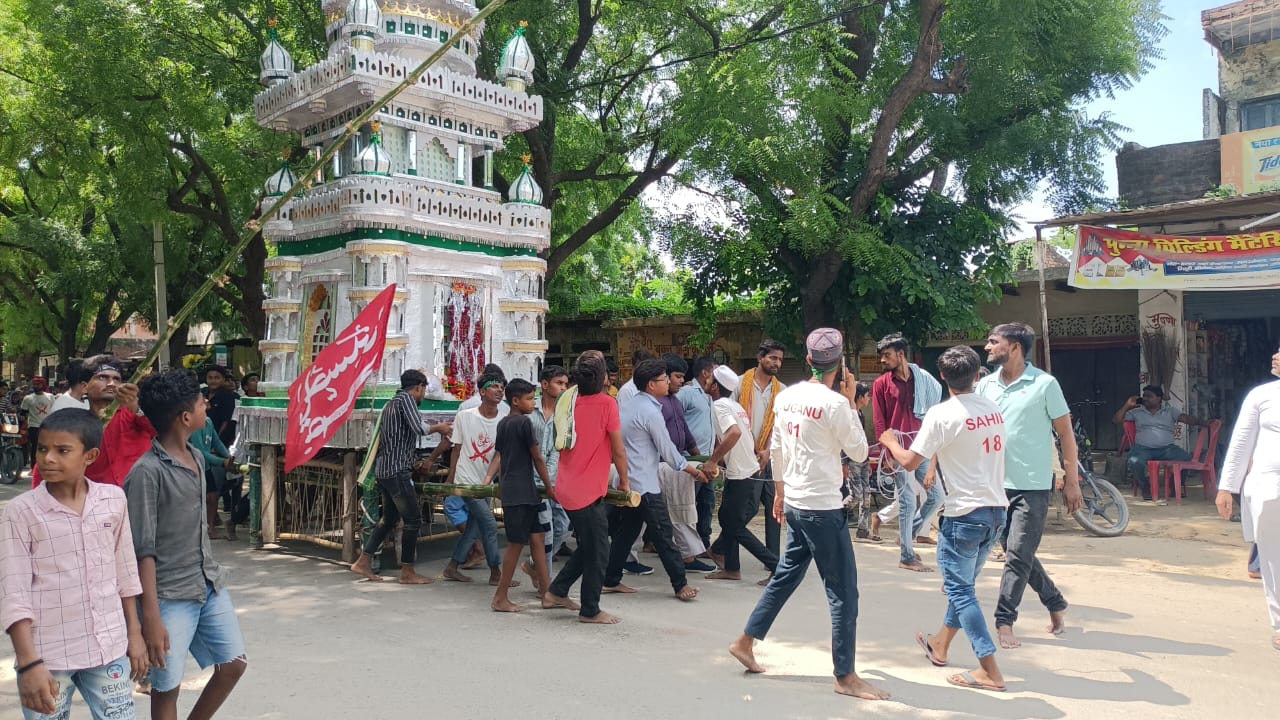 भदोही,दुर्गागंज ।दुर्गागंज थाना क्षेत्र में रविवार को प्रशासन रहा हाई अलर्ट मोड पर जिसके क्रम में कल 11 कर्बलाओं पर 27 ताजियों को भिन्न-भिन्न कर्बलाओं पर ठंडा किया गया कोई घटना न हो इसके लिए 72 स्थान पर प्रशासनिक कैमरा भी लगाया गया सभी कर्बलाओं और ताजियों पर होमगार्ड और पुलिस बल तैनात रहे उप निरीक्षक क्षेत्र में चक्रमण करते रहे मुहर्रम पर ताजिया जुलूस निकाला गया दर्जनों की संख्या में ताजिया निकाला गया भारी संख्या में अकीकतमंद लोग शामिल रहे ताजिया को चौक से उठाकर मानीडीह, बीरा पुर , गड़ौरा,भागीरथी आदि स्थानों पर ताजिया लेकर पहुंचे इस दौरान कई जगह पर मेले का भी आयोजन किया गया ताजिया ले जाते समय भारी संख्या में अकीदतमंद लोग या हुसैन या हुसैन के नारे लगा रहे थे ,या हुसैन जिंदाबाद ,या हुसैन जिंदाबाद भी बोले जा रहे थे ।इस दौरान लोगों में मलीदा भी लोगों को वितरित किया जा रहा था। नव युवकों के द्वारा अपने कला कौशल का भी प्रदर्शन किया गया कुछ लोग ढोल ताशे नगाड़े भी बजाते रहे ।इस मौके पर इब्राहिम , प्रधान नईमुल्ला, हसन, नसरुल्ला, गयासुद्दीन,खलील, जलालुद्दीन शमसुद्दीन आदि लोग मौजूद रहे।