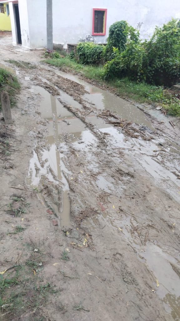 बारिश में गांव वालों का आना-जाना हुआ मुश्किल, सड़क को मरम्मत कराने उठी मांग।