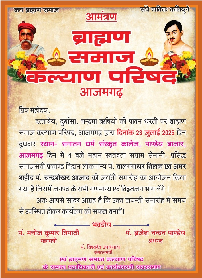 आजमगढ़।सुबह अमर शहीद पण्डित शहीद चन्द्र शेखर आजाद की प्रतिमा पर लगवाई गई छतरी का होगा अनावरण और ब्राह्मण समाज कल्याण परिषद के महामंत्री मनोज कुमार त्रिपाठी ने मंगलवार को एक प्रेस विज्ञप्ति के माध्यम से बताया कि प्रत्येक वर्ष की भांति इस वर्ष भी 23 जुलाई 2025 दिन बुधवार को महान स्वतंत्रता संग्राम सेनानी प0 बाल गंगाधर तिलक जी एवं महान क्रांतिकारी अमर शहीद प0 चन्द्र शेखर आजाद जी की जयंती मनाई जायेगी ।