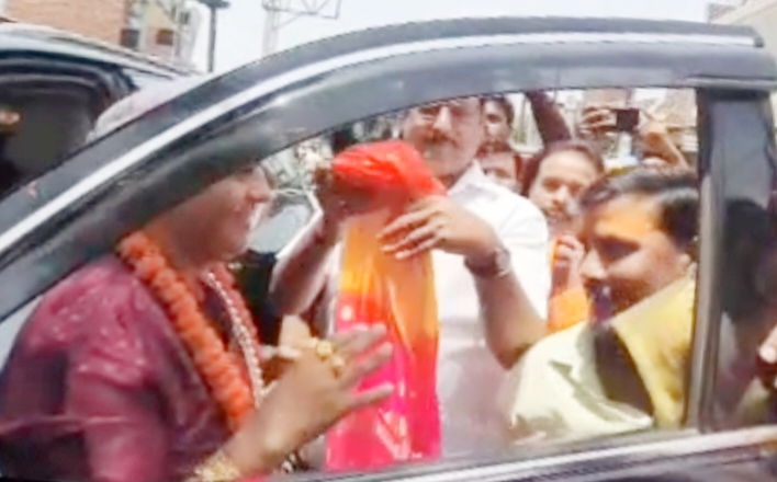 बदायूँ/उसावां। नगर में मनोना धाम के महंत ओमेंद्र सिंह महाराज का गुरुवार को नगर आगमन पर क ब्लॉक गेट पर ब्लॉक प्रमुख ने महंत जी का जोरदार स्वागत किया गया।