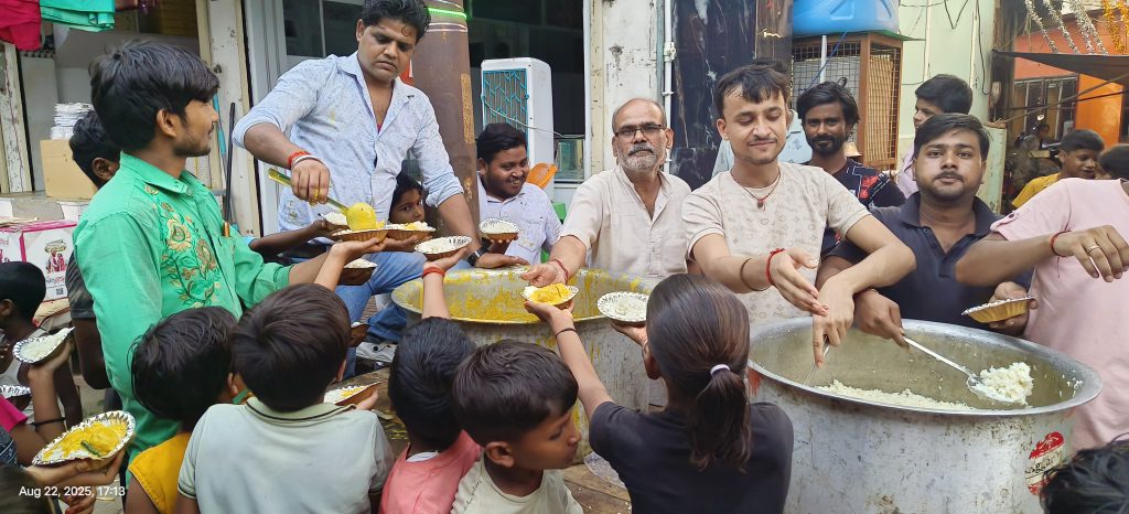 आपको बता दे कि शुक्रवार को नगर के मैन मार्किट में लक्कड़ दास खाटू श्याम शिव मंदिर पर भगवान कृष्ण के जन्मोत्सव के छठवें दिन छठी कार्यक्रम का आयोजन किया गया। मंदिर के प्रमुख प्रधान सेवादार रामगोपाल गुप्ता ने भगवान का श्रृंगार किया, इसके बाद भगवान श्रीकृष्ण व राधारानी को पूड़ी पुए कड़ी भात का भोग लगाया गया। महिलाओं के साथ बच्चों ने नृत्य करते हुए सोहवर गीत गाए और भगवान को रिझाया। प्रसाद के रूप में कढ़ी-भात का वितरण किया, जिसे भक्तों ने चाव से खाया। देर रात तक भगवान की छठी का आयोजन चलता रहा। प्रमुख सेवादार रामगोपाल गुप्ता ने बताया कि भाद्रपद कृष्ण पक्ष अष्टमी के दिन योगेश्वर भगवान श्रीकृष्ण ने अवतार लिया था। इसके छठवें दिन समस्त गोकुल में नंद बाबा के घर पर छठी कार्यक्रम का आयोजन किया गया था। तब से भगवान की छठी मनाने का विधान है। हर साल उसावां धाम लक्कड़ दास खाटू श्याम शिव मंदिर पर भगवान की छठी कार्यक्रम मनाया जाता है। कार्यक्रम के दौरान नगर के व आसपास क्षेत्र के तमाम भक्त उपस्थित रहे।