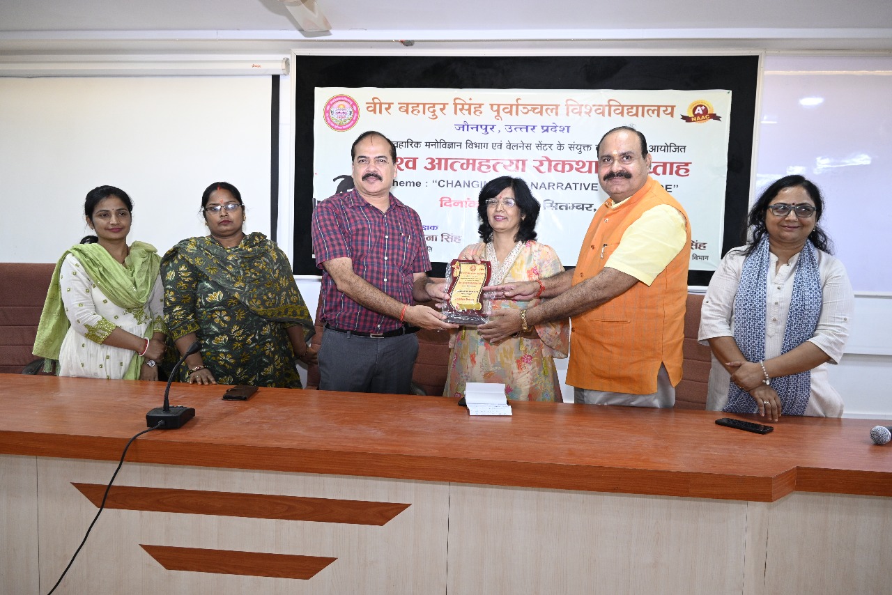 जौनपुर। वीर बहादुर सिंह पूर्वांचल विश्वविद्यालय, जौनपुर में व्यावहारिक मनोविज्ञान विभाग एवं वेलनेस सेंटर के संयुक्त तत्वावधान में संकाय भवन के कांफ्रेंस हाल में विश्व आत्महत्या रोकथाम सप्ताह के दूसरे दिन तनाव प्रबंधन कार्यशाला एवं काउंसलिंग कैम्प “सुनना और समझना” का आयोजन हुआ । वक्ताओं ने जीवन में तनाव मुक्त रहने के टिप्स भी दिए. विश्व आत्महत्या रोकथाम सप्ताह की थीम “आत्महत्या के विषय पर दृष्टिकोण और संवाद को बदलना” है।