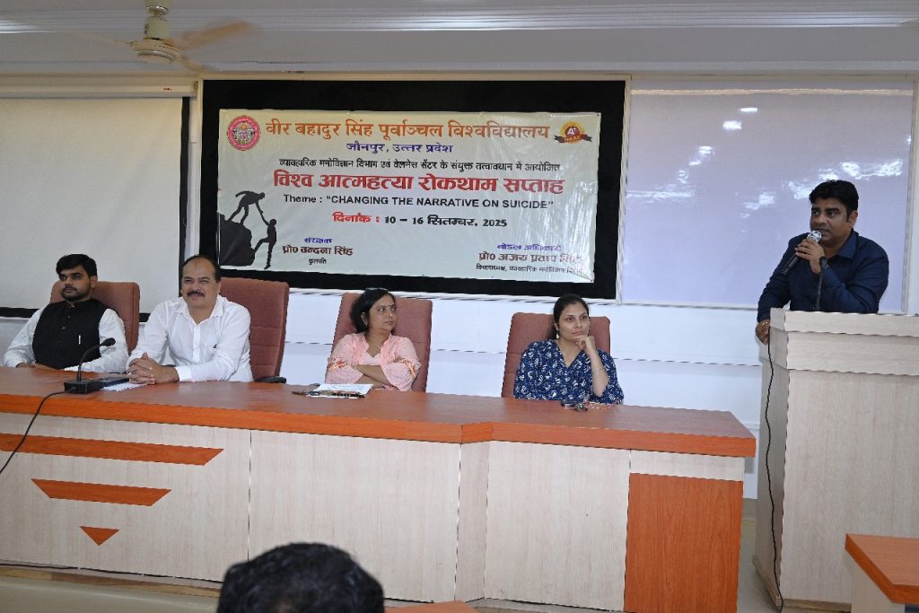 जौनपुर।वीर बहादुर सिंह पूर्वांचल विश्वविद्यालय के संकाय भवन के कॉन्फ्रेंस हॉल में विश्व आत्महत्या रोकथाम सप्ताह के अंतर्गत एक सार्थक और विचारोत्तेजक पैनल डिस्कशन का आयोजन किया गया। इसका विषय था – “परिवार, मित्र और समाज की आत्महत्या रोकथाम में भूमिका।”