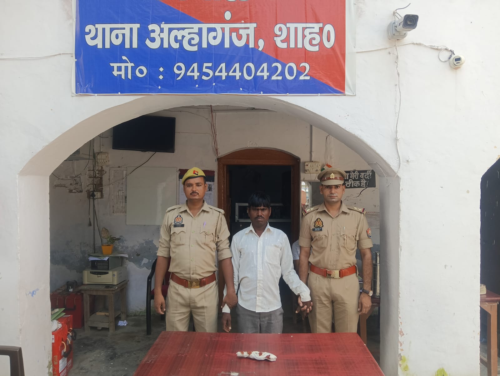 उ0नि0 अजय कुमार मय हमराही तौफीक का0 सुमित कुमार के थाना क्षेत्र में मामूर थे कि मुखबिर खास द्वारा सूचना मिली कि एक व्यक्ति एक व्यक्ति के0डी0 सिंह स्कूल के सामने ग्राम सपहा जाने वाले रास्ते पर पैदल जा रहा है, जिसके पास नजायज तमंचा है और कोई अपराध करने की फिराक में है। यदि जल्दी की जाए तो पकडा जा सकता है । इस सूचना उ0नि0 अजय कुमार मय टीम उपरोक्त द्वारा के0डी0 सिंह स्कूल के सामने से ग्राम सपहा जाने वाले रास्ते पर करीब 300 कदमों की दूरी पर अभियुक्त राकेश पुत्र मुंशी निवासी ग्राम मनिहार थाना अल्हागंज जनपद शाहजहाँपुर उम्र करीब 45 वर्ष को गिरफ्तार किया गया।जिसके कब्जे से एक अदद अवैध तमंचा नाजायज 315 बोर मय 01 अदद जिन्दा कारतूस 315 बोर नाजायज बरामद हुआ । उपरोक्त बरामदगी के आधार पर नियमानुसार थाना पुलिस ने आर्म्स एक्ट के तहेत मुकदमा पंजीकृत किया गया हैं। अभियुक्त उपरोक्त को विधिक कार्यवाही उपरान्त न्यायिक हिरासत में भेजा जा रहा है।