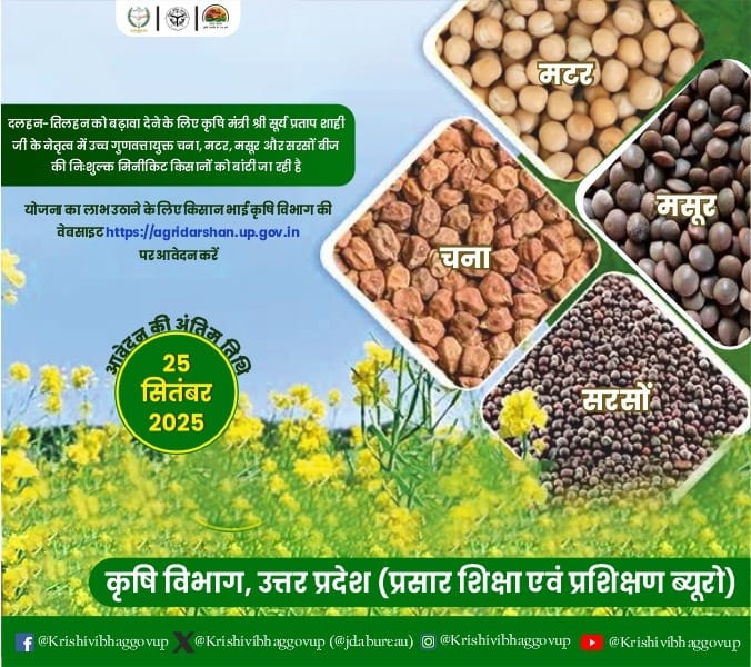 दलहन-तिलहन उत्पादन को बढ़ावा देने के लिए उत्तर प्रदेश सरकार किसानों को उच्च गुणवत्तायुक्त चना, मटर, मसूर और सरसों के बीज की निःशुल्क मिनीकिट उपलब्ध करा रही है। इस योजना की शुरुआत कृषि मंत्री श्री सूर्य प्रताप शाही जी के नेतृत्व में की गई है।