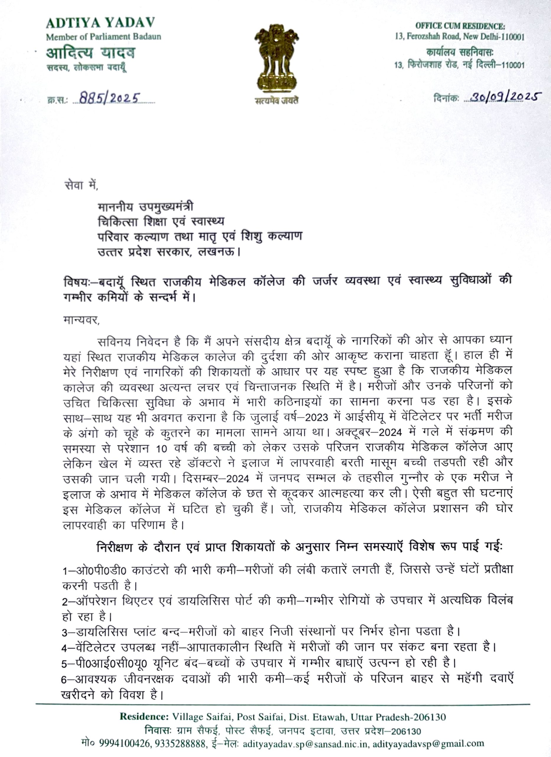बदायूँ सांसद आदित्य यादव ने उप मुख्यमंत्री को पत्र लिख कर राजकीय मेडिकल कॉलेज की जर्जर व्यवस्था एवं स्वास्थ्य सुविधाओं की गम्भीर कमियों के सन्दर्भ में अवगत कराया।