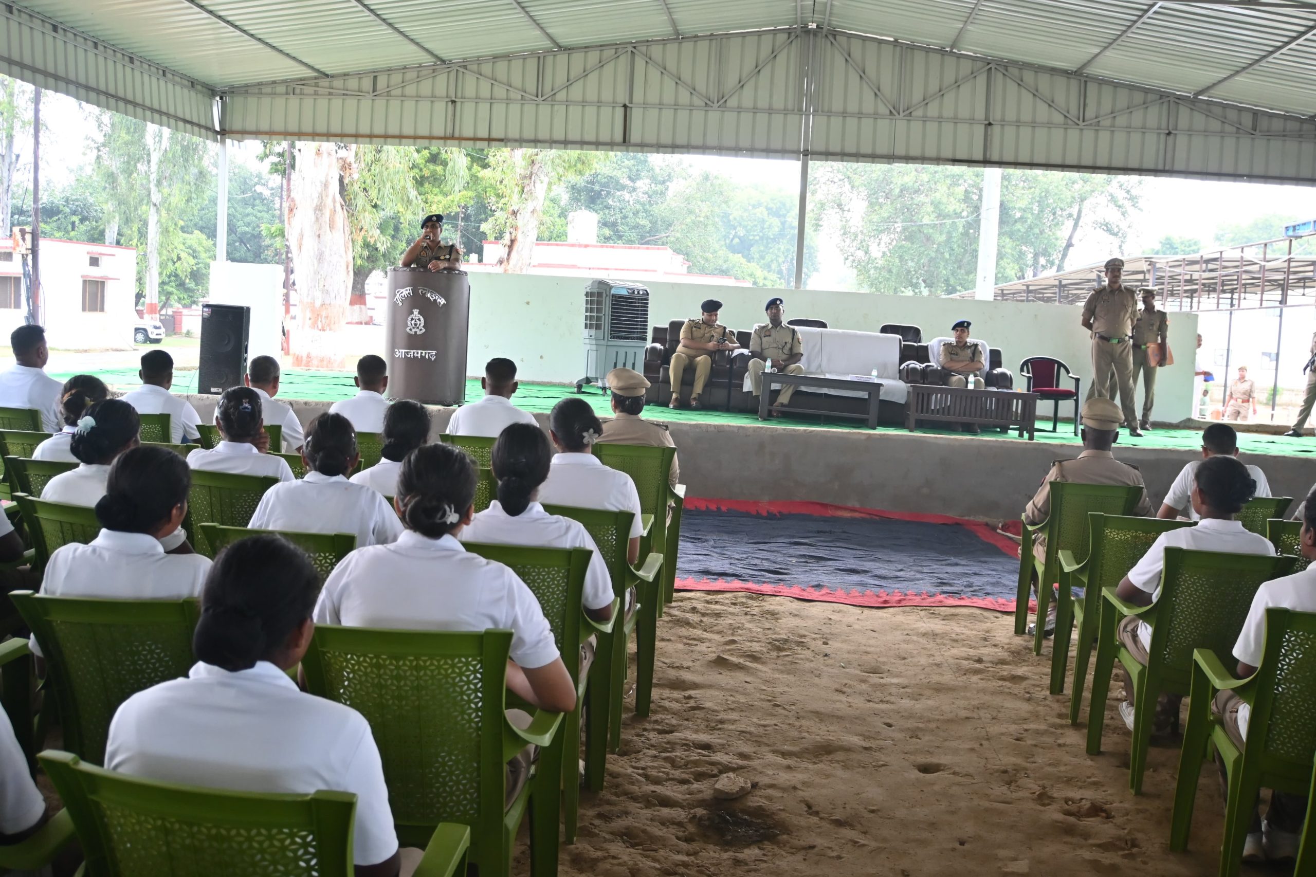आजमगढ़।वरिष्ठ पुलिस अधीक्षक डॉ0 अनिल कुमार द्वारा पुलिस लाइन आजमगढ़ में महिला रिक्रूट आरक्षियों का सैनिक सम्मेलन आयोजित किया गया। सम्मेलन में प्रशिक्षण, दैनिक दिनचर्या एवं भविष्य की जिम्मेदारियों को लेकर उपयोगी मार्गदर्शन प्रदान किया गया। वरिष्ठ पुलिस अधीक्षक द्वारा महिला रिक्रुट आरक्षियों को विजयादशमी की बधाई देते हुए स्पोर्ट्स, मेस, कल्चरल प्रोग्राम व ट्रेनिंग आदि के सम्बन्ध में ब्रीफ किया गया।
