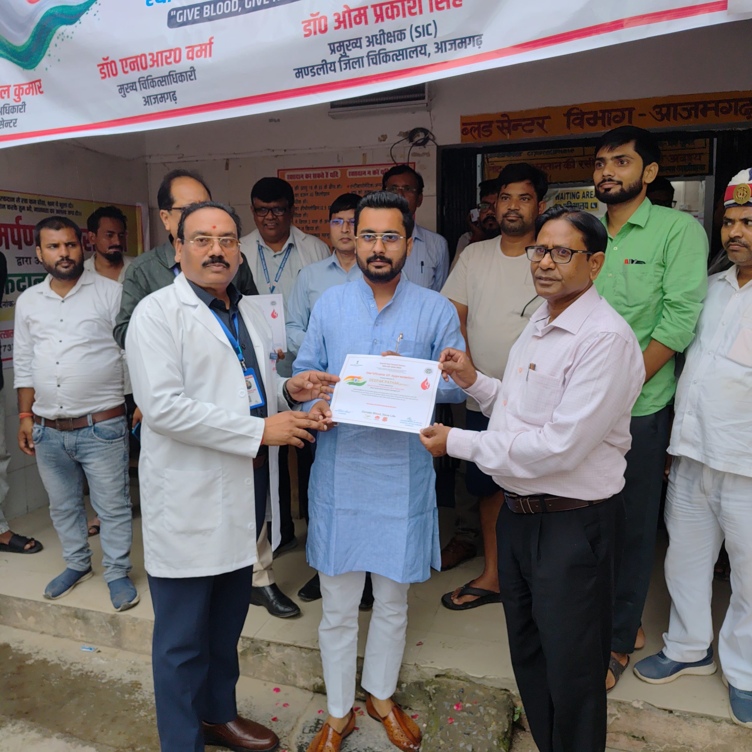 आज़मगढ़ ।समाज सेवा की मिसाल पेश करते हुए “समर्पण सेवा संगठन” ने एक विशेष पहल की। संगठन के संस्थापक और डीएवी पीजी कॉलेज छात्रसंघ मंत्री दीपक पाठक माइकल के जन्मदिवस के अवसर पर मंडलीय जिला चिकित्सालय में रक्तदान शिविर का आयोजन किया गया। इस शिविर में संगठन के युवाओं ने बढ़-चढ़कर हिस्सा लिया और जरूरतमंदों के लिए रक्तदान किया। कार्यक्रम का शुभारंभ मुख्य चिकित्सा अधिकारी, एसआईसी ओम प्रकाश सिंह, ब्लड बैंक अधीक्षक और सत्यम गुरु ने संयुक्त रूप से फीता काटकर किया। दीपक पाठक ने बताया कि यह कार्यक्रम पिछले चार वर्षों से लगातार आयोजित किया जा रहा है और संगठन का नाम पहले “सत्यमेव जयते” हुआ करता था, जिसे अब बदलकर “समर्पण सेवा संगठन” कर दिया गया है।