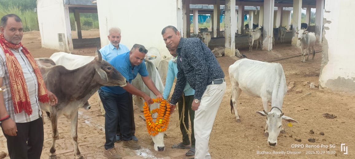 बदायूँ/उसावां।विकास खण्ड उसावां,आज गोपाष्टमी के शुभ अवसर पर मुख्य पशु चिकित्सा अधिकारी बदायूं के निर्देशन पर पशु चिकित्सा अधिकारी उसावां डॉ योगेश कुमार व गौ रक्षा ट्रेडर्स के ठेकेदार गौरव सोलंकी द्वारा विकासखंड उसावां जनपद बदायूं द्वारा संचालित ब्रह्द गौशाला वीरमपुर भदेली में गौ पूजन कार्य कर गायों को गुड, हरा चारा खिलाया । इस मौके पर सतीश सैनी वेटनरी फार्मासिस्ट द्वारा गौ सेवा के महत्व को बताया और बताया कि समुद्र मंथन के दौरान कामधेनु गाय की उत्पत्ति हुई थी । कामधेनु गाय की पूजा करने से घर में सुख समृद्धि और शांति आती है ।
