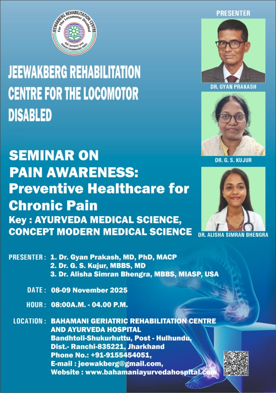 रांची। जीवकबर्ग आरोग्य महाविद्यालय (जीवकबर्ग कॉलेज ऑफ मेडिसिन) रांची में 8 और 9 नवंबर 2025 को दर्द जागरूकता विषय पर दो दिवसीय सेमिनार आयोजित किया जा रहा है, जिसमें पुराने दर्द की रोकथाम और समग्र उपचार पद्धतियों पर विस्तृत चर्चा की जाएगी। सेमिनार का उद्देश्य तीव्र और दीर्घकालिक दर्द के बीच अंतर को स्पष्ट करना, दर्द के बढ़ने के जोखिम कारकों की पहचान करना और आधुनिक चिकित्सा, आयुर्वेद तथा जीवनशैली आधारित उपचारों को एकीकृत कर प्रभावी स्वास्थ्य प्रबंधन का मॉडल प्रस्तुत करना है। इस दौरान विशेषज्ञ यह बताएंगे कि किस प्रकार समय से पहले हस्तक्षेप, संतुलित आहार, व्यायाम, योग, मानसिक स्वास्थ्य देखभाल और रोगी जागरूकता के माध्यम से क्रोनिक दर्द को गंभीर रूप लेने से रोका जा सकता है।कार्यक्रम में शारीरिक और मानसिक स्वास्थ्य की भूमिका, सार्वजनिक और रोगी शिक्षा की आवश्यकता, बहु-विशिष्ट टीम की भागीदारी और आयुर्वेद तथा योग के वैज्ञानिक आधार पर उपचार की रणनीतियों को व्यावहारिक रूप से समझाया जाएगा। आयोजन बहमनी जेरिएट्रिक रिहैबिलिटेशन सेंटर एवं आयुर्वेद अस्पताल रांची द्वारा किया जा रहा है तथा संचालन जीवकबर्ग आयुर्वेद महाविद्यालय करेगा। सेमिनार में प्रमुख वक्ता डॉ. जी.एस. कुजूर (एमबीबीएस, एमडी), सहायक प्रोफेसर, पलामू मेडिकल कॉलेज एवं अस्पताल, झारखंड सरकार और डॉ. अलीशा सिमरन भेंगरा (एमबीबीएस, एमआईएएसपी, यूएसए) होंगे।