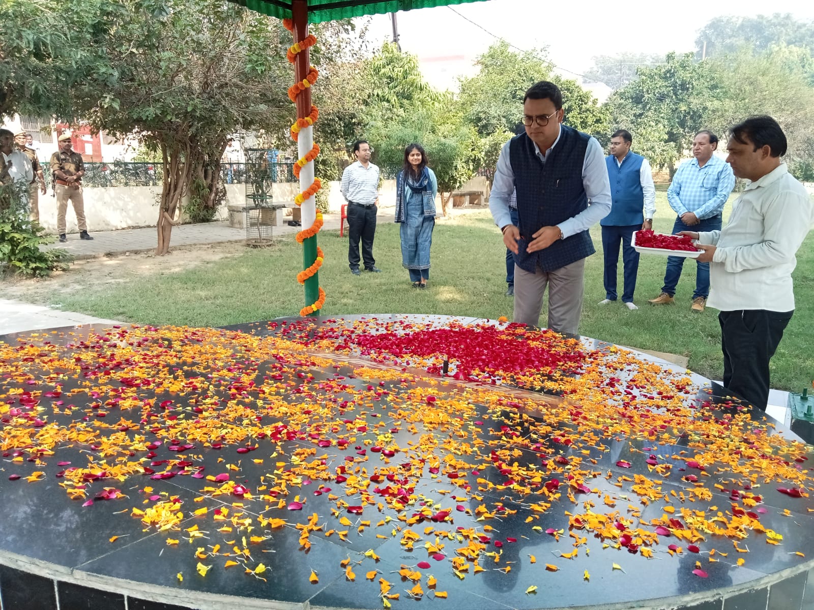 बदायूँ । माना जाता है कि श्री बंकिम चन्द्र चटर्जी द्वारा रचित वंदे मातरम गीत अक्षय नवमी. जो वर्ष 1875 में 07 नवम्बर की थी, के शुभ अवसर पर लिखा गया था। राष्ट्रीय गीत वंदे मातरम के 150 वर्ष पूरे होने के उपलक्ष्य पर माननीय मुख्यमंत्री जी के लोक भवन लखनऊ में आयोजित कार्यक्रम का कलेक्ट्रेट स्थित एनआईसी सभागार में सजीव प्रसारण किया, वहीं डीएम अवनीश राय व अन्य पुलिस तथा प्रशासनिक अधिकारियों ने शहीद स्थल पर पुष्प अर्पित कर शहीदों को नमन किया। स्कूली छात्राओं ने राष्ट्रीय गीत वंदे मातरम का गायन भी किया। इस अवसर पर अधिकारी व कर्मचारी मौजूद रहे।