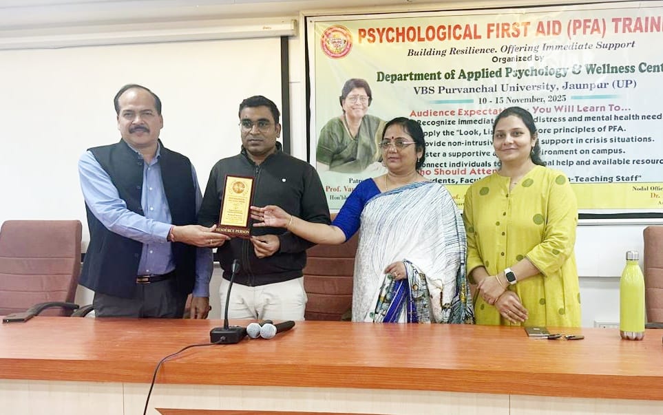 जौनपुर। वीर बहादुर सिंह पूर्वांचल विश्वविद्यालय के अनुप्रयुक्त मनोविज्ञान विभाग एवं वेलनेस केंद्र द्वारा आयोजित पाँच दिवसीय ‘मनोवैज्ञानिक प्राथमिक सहायता (पीएफ़ए) प्रशिक्षण’ कार्यशाला का समापन संकाय भवन के कांफ्रेंस हॉल में हुआ। कार्यशाला में विद्यार्थियों को ‘देखो, सुनो, जोड़ो’ के मूल सिद्धांतों पर आधारित मनोवैज्ञानिक प्राथमिक सहायता के विभिन्न पहलुओं से परिचित कराया गया।