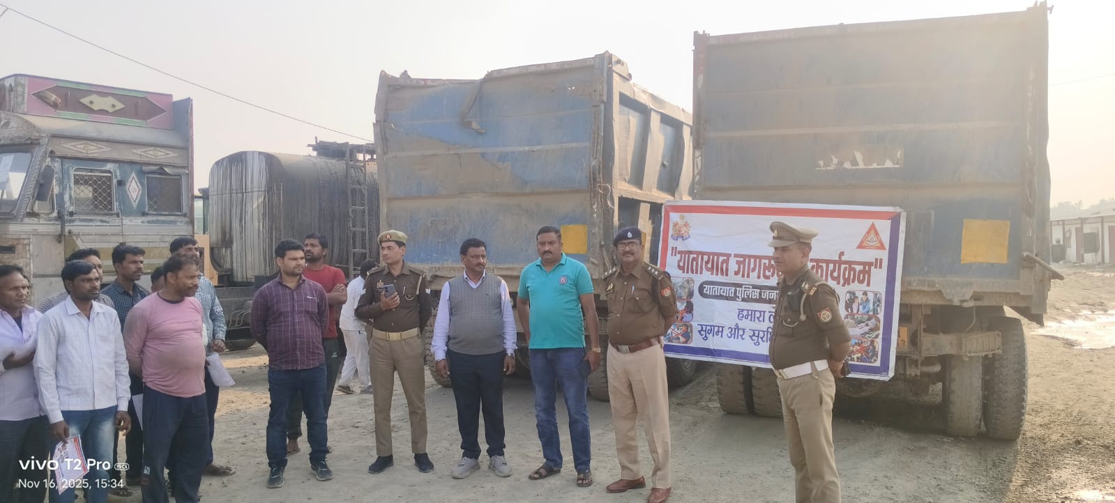 शाहजहाँपुर।यातायात पुलिस एवं परिवहन विभाग द्वारा ट्रक एवं डम्पर चालकों को सड़क सुरक्षा जागरूकता का संदेश ।
