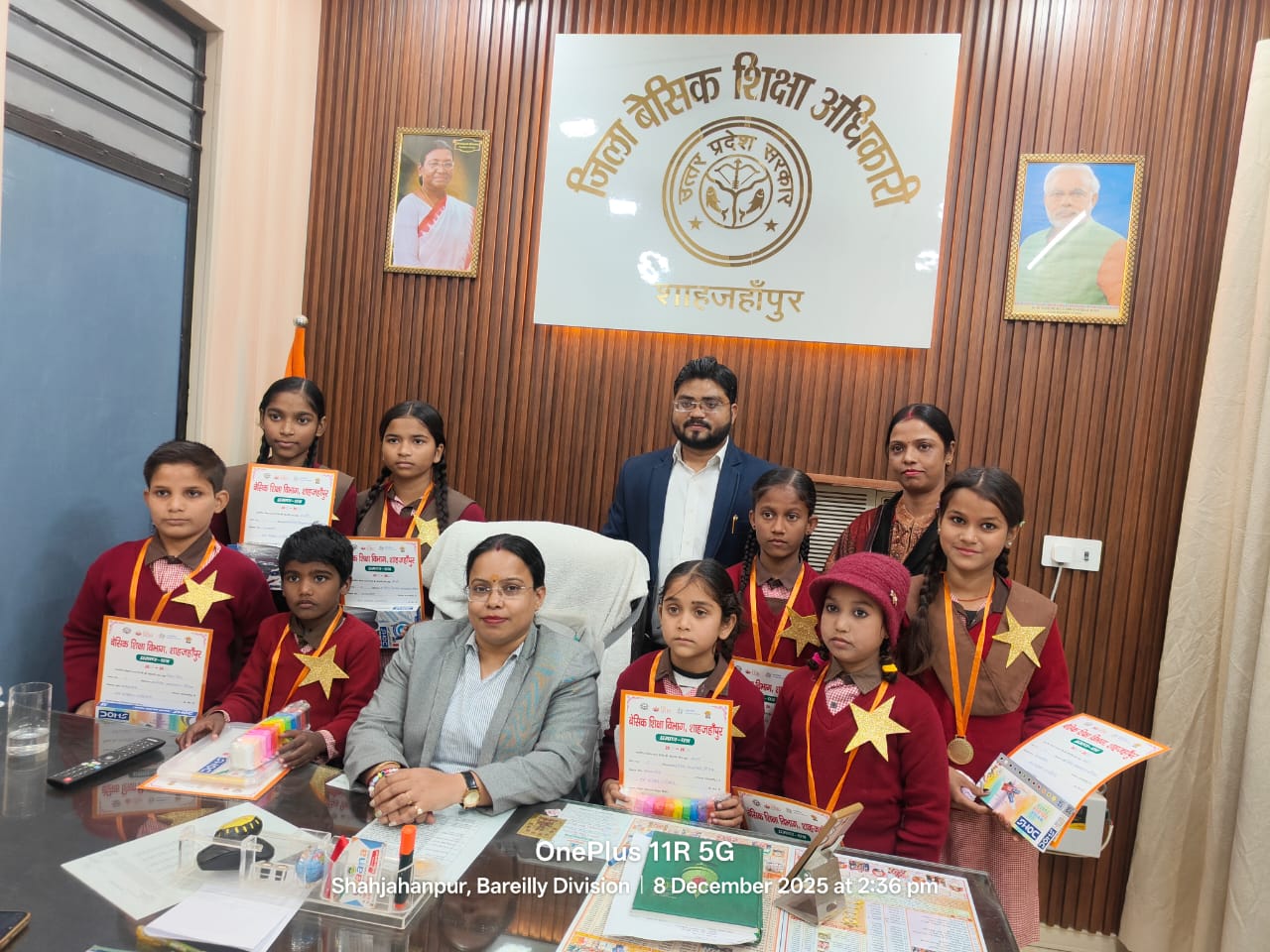 बेसिक शिक्षा अधिकारी शाहजहांपुर दिव्या गुप्ता द्वारा चलाई जा रही अनूठी पहल के अंतर्गत कंपोजिट विद्यालय शाहमतगंज गौटिया के बच्चों को शत प्रतिशत उपस्थिति के लिए जिला बेसिक शिक्षा अधिकारी कार्यालय में सम्मानित किया गया। सम्मान की इस अनूठी पहल के बारे में बीएसए दिव्या गुप्ता ने बताया की शत प्रतिशत उपस्थिति वाले बच्चों के फोटो संबंधित विद्यालय द्वारा आकर्षक ढंग से कार्यालय में डैशबोर्ड पर लगाए जाते हैं। तत्पश्चात संबंधित बच्चों को सम्मानित किया जाता है।उन्होंने बेसिक शिक्षा विभाग शाहजहांपुर द्वारा संचालित परिवर्तन और संकल्प समूह के कार्यों की भूरि भूरि प्रशंसा करते हुए सभी शिक्षकों का आवाहन किया कि अपने-अपने विद्यालयों में शासन की मंशानुसार कार्यों को उत्कृष्टता के साथ कराए जिसका लाभ शैक्षिक एवं सामाजिक दृष्टि से बच्चों को प्राप्त हो और उनके भविष्य की स्वर्णिम आधारशिला रखी जा सके । बच्चों के सम्मान की मुहिम में उत्साह वर्धन करने के लिए सर्टिफिकेट, मेडल और स्टार से सम्मानित किया जाता है। आज सम्मानित होने वाले बच्चों में अनस, जन्नत ,उमरा, प्रिंस सिंह, लवी, पिंकी पाल, जानवी और नैंसी शामिल है। विद्यालय के बच्चों के साथ-साथ सहायक अध्यापक रोहित कुमार सक्सेना एवं सहायक अध्यापिका अर्चना कुमारी को भी प्रशंसनीय कार्य के लिए सम्मानित किया गया। द्वितीय सप्ताह में प्राथमिक विद्यालय सौफरी ब्लॉक खुटार द्वारा बीएसए कार्यालय के डैशबोर्ड पर शत प्रतिशत उपस्थिति देने वाले बच्चों की फोटो सज्जा विद्यालय इंचार्ज तरन्नुम बी द्वारा की गई है।