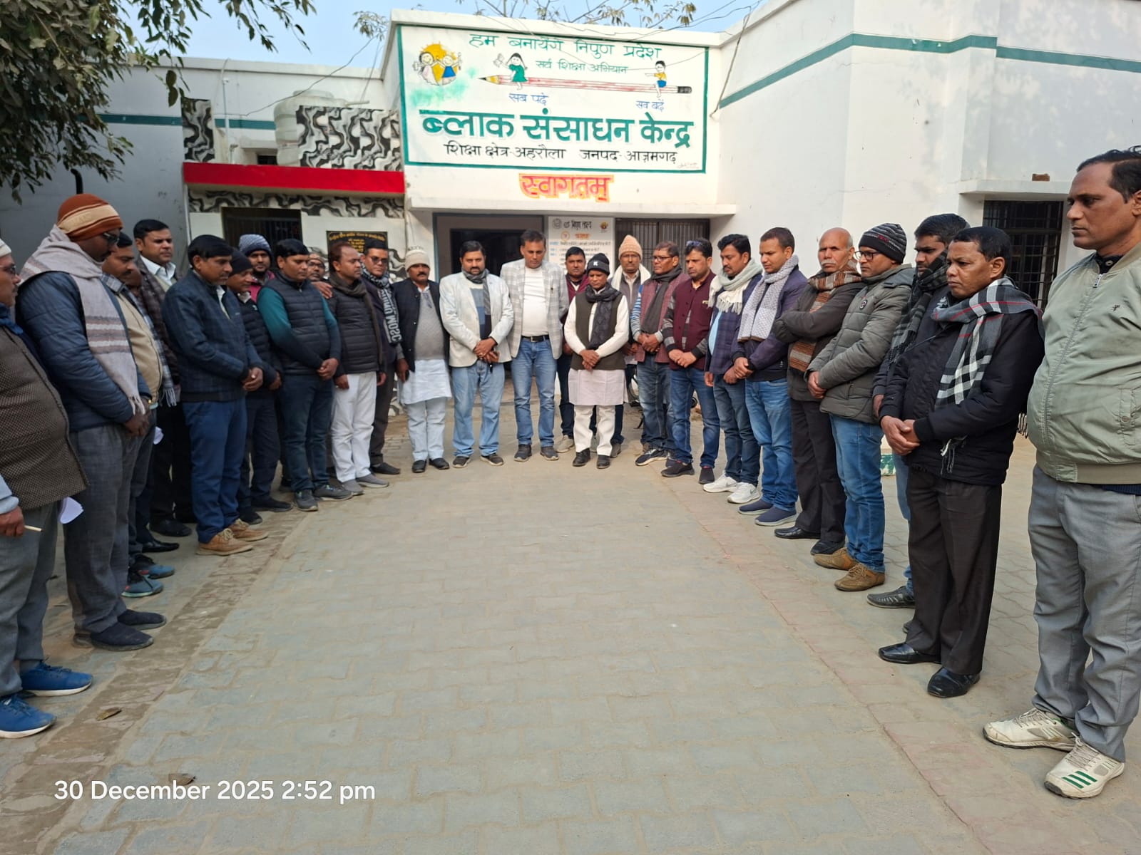 आजमगढ़। बीआरसी कार्यालय पर मंगलवार को शिक्षा क्षेत्र के शिक्षकों ने उत्तर प्रदेशीय प्राथमिक शिक्षक संघ के जिला अध्यक्ष अभिमन्यु यादव और खंड शिक्षा अधिकारी संतोष कुमार सिंह के अध्यक्षता में शोक सभा कर 2 मिनट का मौन रखकर देवहट्टा प्राथमिक विद्यालय के प्रधानाध्यापक वीरेंद्र यादव (50) खलिया मंझारी निवासी का बीते 26 दिसंबर को स्कूल से घर जाते समय सड़क दुर्घटना में मौत हो गई थी उनके निधन पर शिक्षकों ने शोक सभा कर मृत साथी के प्रति शोक संवेदना व्यक्त की संघ के जिलाध्यक्ष अभिमन्यु यादव ने कहा कि हमने सड़क दुर्घटना में एक शिक्षक साथी को खो दिया है हम संगठन की तरफ से जो भी सहयोग हो सकता है हम उस परिवार के साथ खड़े हैं। इस मौके पर प्राथमिक संघ के ब्लॉक अध्यक्ष सूबेदार यादव, सूरज लाल यादव, देवेंद्र यादव, राम नारायण गुप्ता, अरविंद कुमार सिंह, पवन कुमार चौबे रविकांत पांडेय, महादेव, राजू यादव, कृष्ण कुमार शुक्ला, स्वामीनाथ, राधेश्याम, आदि लोग मौजूद रहे।