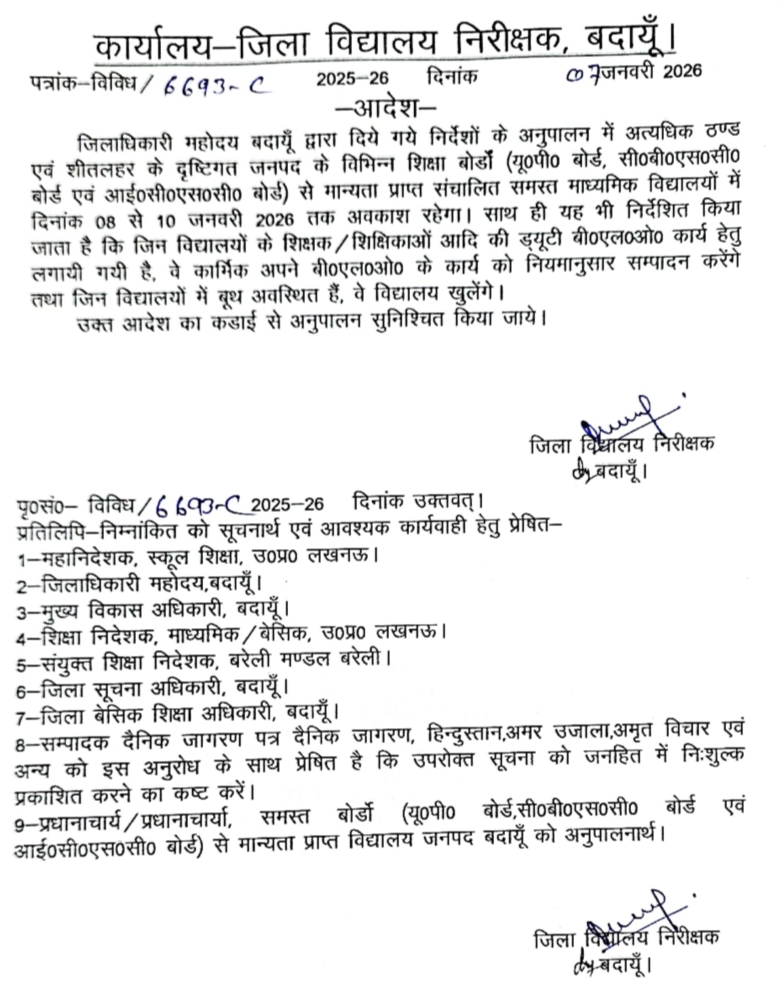 बदायूं। जिलाधिकारी के निर्देशानुसार अत्यधिक ठंड और शीतलहर को देखते हुए जनपद के यूपी बोर्ड, सीबीएसई व आईसीएसई बोर्ड से मान्यता प्राप्त सभी माध्यमिक विद्यालयों में 8 से 10 जनवरी 2026 तक अवकाश रहेगा। हालांकि, जिन विद्यालयों में मतदान बूथ बनाए गए हैं वे खुले रहेंगे। साथ ही बीएलओ ड्यूटी पर तैनात शिक्षक एवं कर्मचारी अपने कार्य का नियमानुसार पालन करेंगे।