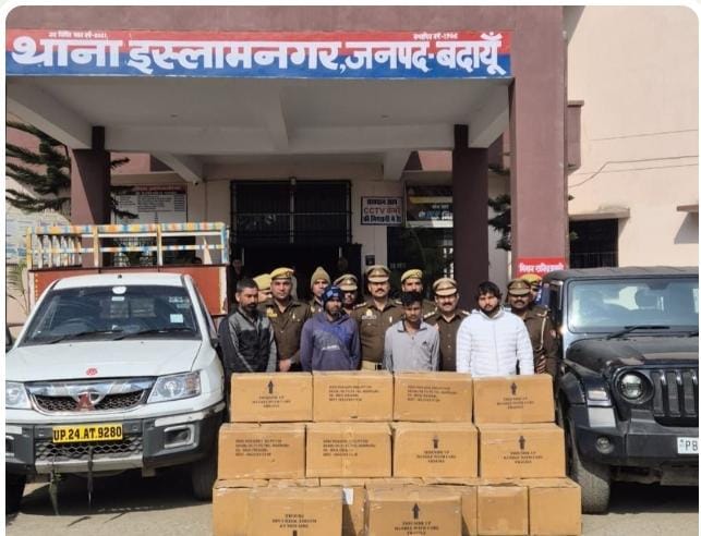 बदायूं। वरिष्ठ पुलिस अधीक्षक, बदायूँ डॉ0 बृजेश कुमार सिंह के कुशल निर्देशन में अपराध की रोकथाम एवं अपराधियों की गिरफ्तारी अभियान के अन्तर्गत थाना इस्लामनगर पुलिस द्वारा मुखबिर की सूचना पर गंगा एक्सप्रेस-वे हाईवे क्रासिंग अण्डरपास चन्दौसी रोड पर बैरियर लगाकर सघन चैकिंग के दौरान एक सफेद रंग की टाटा पिकअप एक थार गाड़ी काले रंग की बैरियर में टक्कर मारते हुए तेजी से इस्लामनगर की ओर भाग गयी तथा पिकअप गाड़ी में बैठे 4 अभियुक्तगण सुमित वर्मा पुत्र भजनलाल उम्र 30 वर्ष नि0 मौ0 सुन्दरनगर थाना मोली जागरा जिला चन्डीगढ़ मूल पता ग्राम लस्करपुर थाना ओरास जिला उन्नाव 2. गुड्डू पुत्र मकबूल उम्र 22 वर्ष नि0 मौ0 सैनी कालोनी वार्ड नं0 24 थाना माडल टाउन जिला पानीपत हरियाणा 3. पारुल पुत्र प्रताप सिह उम्र 26 वर्ष नि0 ग्राम खरेटी थाना जुलाना जिला जीन्द हरियाणा 4. मनीश शर्मा पुत्र उत्तम चन्द्र शर्मा उम्र 32 वर्ष नि0 दफऱपुर थाना डेरावासी जिला माहोली चन्डीगढ़ को 25 कार्टन 100 पेटी अवैध शराब सभी कार्टन पर हिमालय ड्रग कम्पनी का लेवल लगा है समेत मौके से गिरफ्तार किया गया । उक्त पिकअप वाहन को धारा 207 एमबी एक्ट के अन्तर्गत सीज किया गया एवं थार गाड़ी को लावारिस हालत में बिसौली से बरामद किया गया। गिरफ्तार अभियुक्तगण ने बताया की थार गाड़ी उनके मालिक सुनील की है जो थार में अपने एक अन्य साथी के साथ बैठा था, जो गाड़ी को छोड़कर भाग गये। इस सम्बन्ध अभियुक्तगण के विरूद्ध विधिक कार्यवाही की जा रही है ।