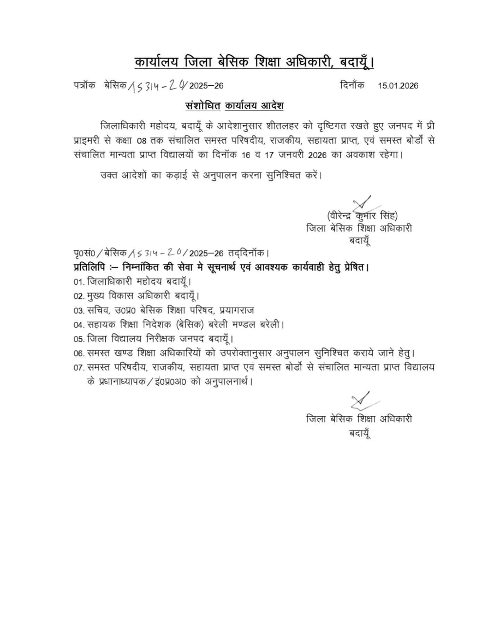 बदायूँ। जनपद बदायूँ में अत्यधिक शीतलहर और कड़ाके की ठंड को देखते हुए जिला प्रशासन ने छात्रों के स्वास्थ्य को ध्यान में रखते हुए बड़ा फैसला लिया है। जिला बेसिक शिक्षा अधिकारी वीरेन्द्र कुमार सिंह के आदेशानुसार कक्षा 1 से 8 तक के सभी परिषदीय विद्यालयों, मान्यता प्राप्त विद्यालयों एवं अशासकीय सहायता प्राप्त स्कूलों में 16 जनवरी 2026 से 17 जनवरी 2026 तक अवकाश घोषित किया गया है।