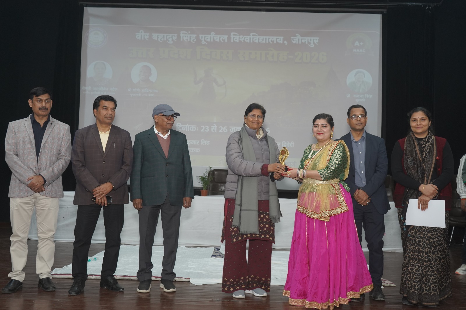 जौनपुर। वीर बहादुर सिंह पूर्वांचल विश्वविद्यालय के आर्यभट्ट सभागार में शनिवार को उत्तर प्रदेश दिवस समारोह का धूमधाम से मनाया गया। कुलपति प्रो. वंदना सिंह ने समारोह के अंतर्गत आयोजित प्रतियोगिता के प्रतिभागियों को पुरस्कृत किया. प्रख्यात आल्हा सम्राट फौजदार सिंह ने वीर रस में की गई अपनी प्रस्तुति से लोगों का मनमोह लिया. विश्वविद्यालय के विद्यार्थियों ने लोक सांस्कृतिक कार्यक्रम भी प्रस्तुत किया।