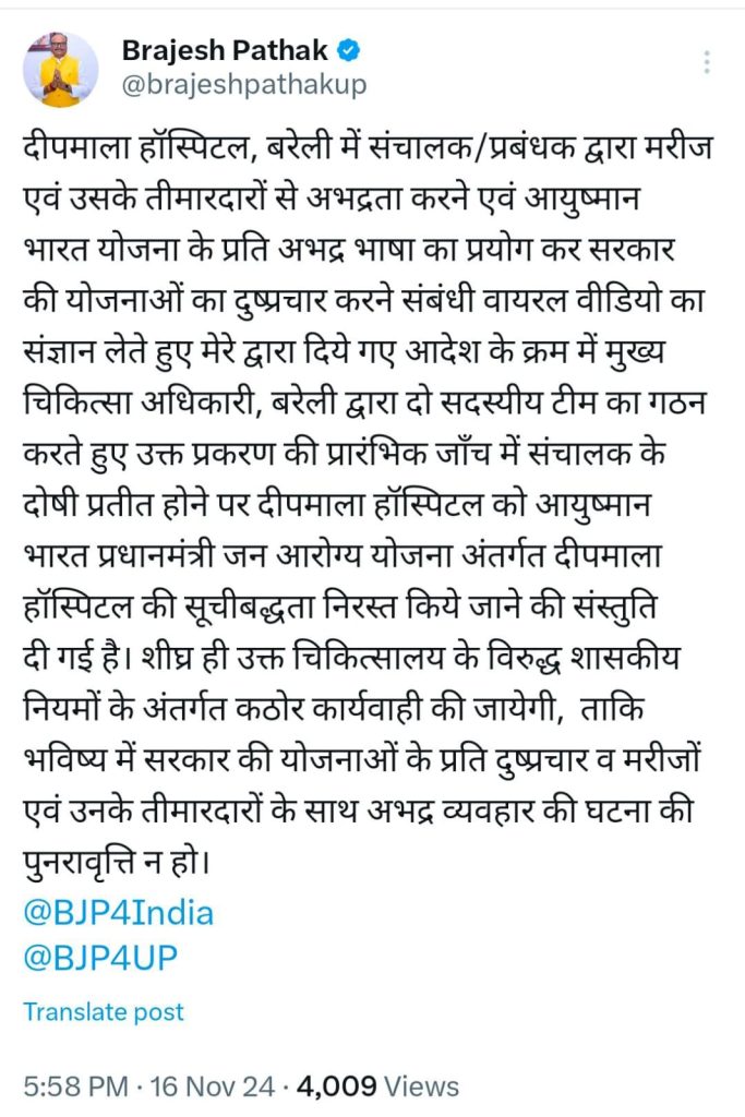 बरेली । मरीज से अभद्रता और आयुष्मान भारत योजना को लेकर टिप्पणी करने के मामले में दीपमाला अस्पताल के डॉ. सोमेश मेहरोत्रा की मुश्किलें बढ़ती नजर आ रही है ।शनिवार को डिप्टी सीएम बृजेश पाठक ने अपने ट्विट कर दीपमाला अस्पताल की आयुष्मान संबद्धता समाप्त करने की संस्तुति करने की जानकारी दी।