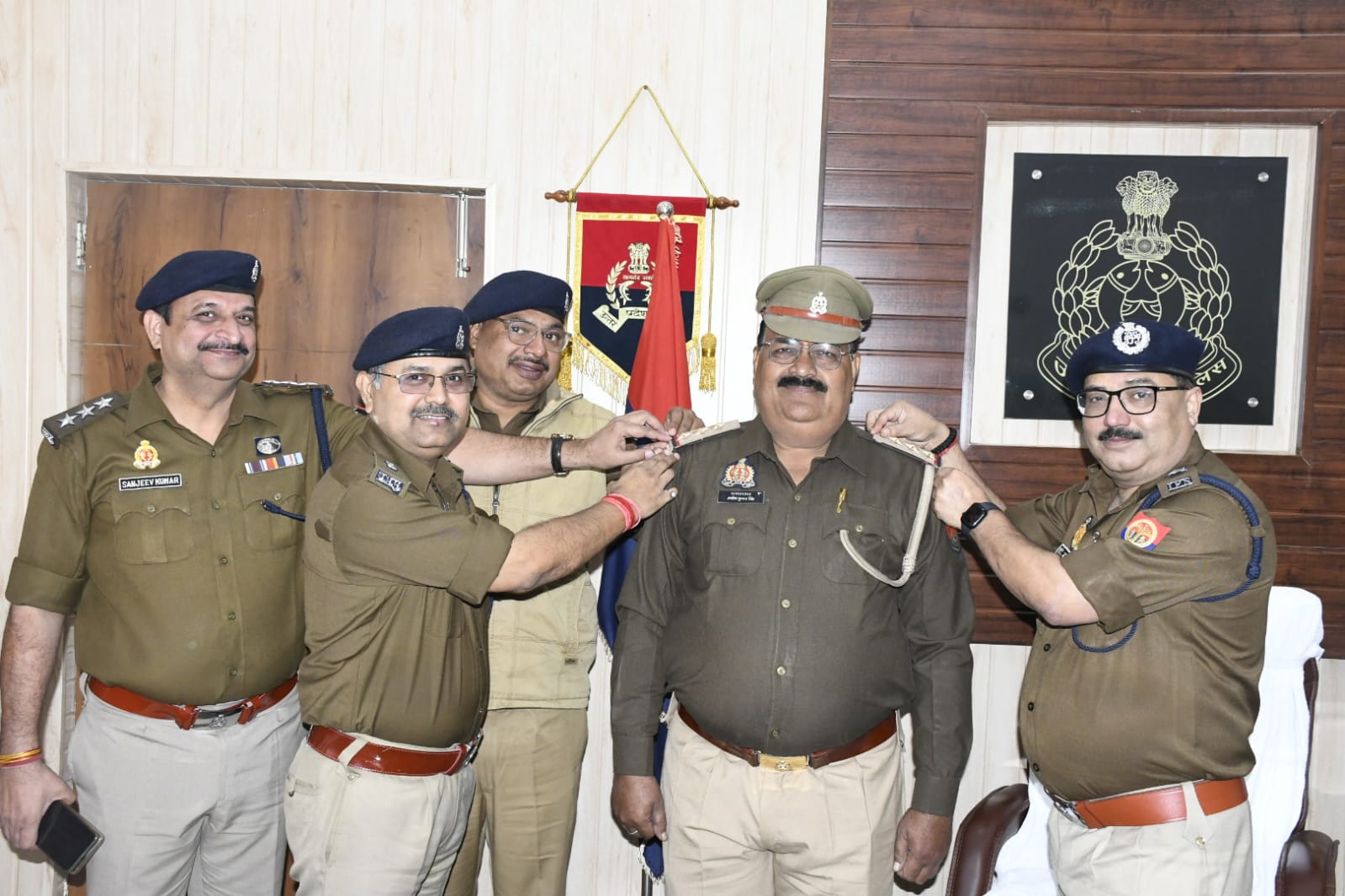 उपनिरीक्षक से निरीक्षक के पद पर प्रोन्नत हुए अशोक कुमार को एस एस पी ने वर्दी पर सजाए स्टार दी बधाई