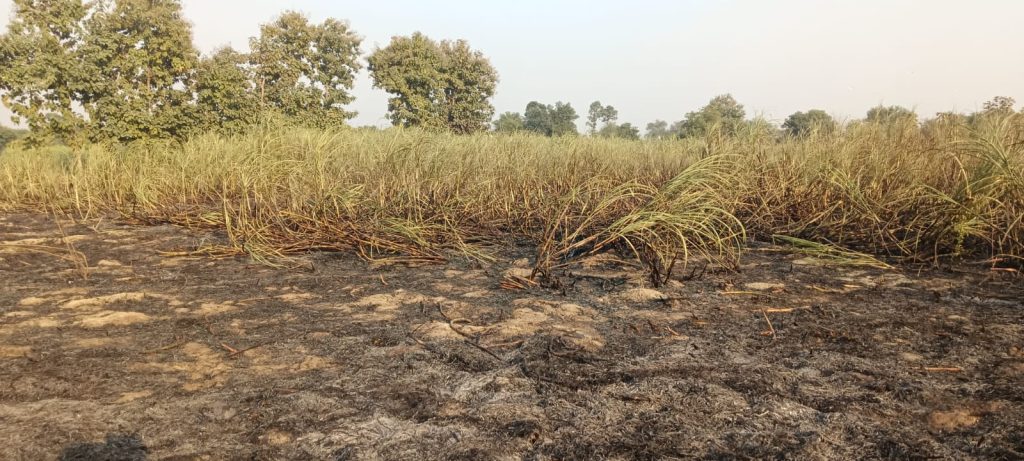 अहरौला के पकड़ी में आग लगने से दो बीघा गन्ना जला