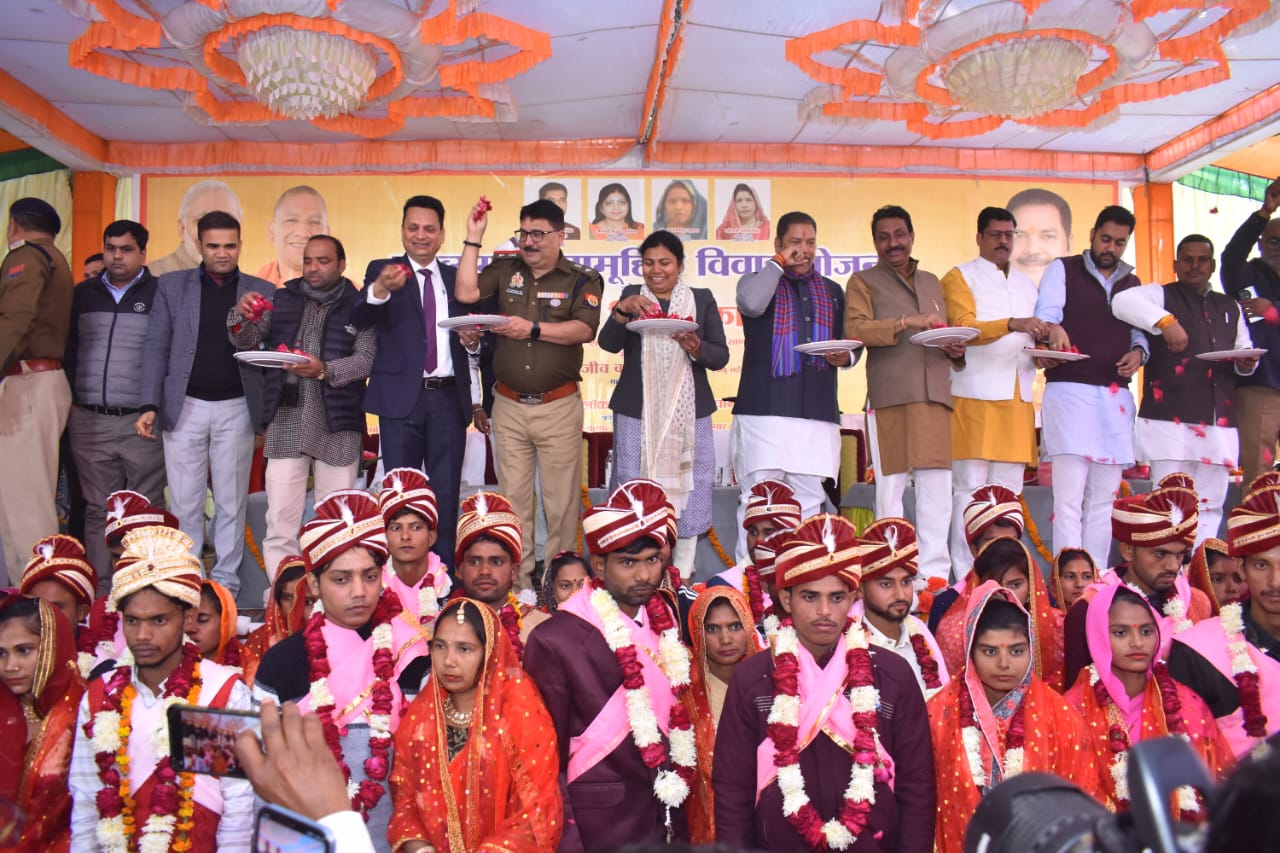 जिलाधिकारी निधि श्रीवास्तव द्वारा अपने उद्बोधन में कहा गया मुख्यमंत्री सामूहिक विवाह योजना उत्तर प्रदेश सरकार की एक अनूठी योजना है, जिसके अंतर्गत सभी धर्मो का उनके रीति रिवाज से विवाह संपन्न करा कर दहेज रहित विवाह का संदेश दिया जाता है। उन्होंने बताया कि प्रत्येक विवाह के लिए सरकार द्वारा रुपए 51000 की धनराशि व्यय की जाती है , जिसमें से रुपए 35000 कन्या के बैंक खाते में व रुपए 10000 का वैवाहिक सामान आदि दिया जाता है तथा रुपए 6000 प्रत्येक जोड़े के विवाह कार्यक्रम आदि में व्यय होते हैं।