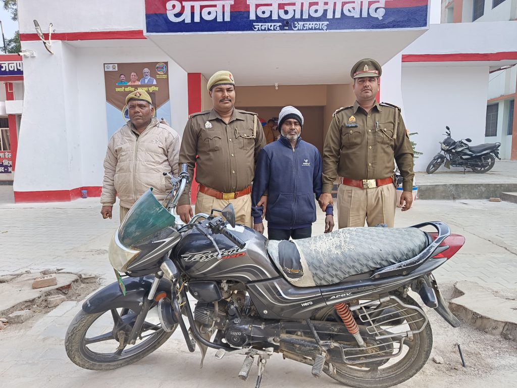 आजमगढ़। उ0नि0 सुधीर पाण्डेय व उ0नि0 कमला प्रसाद मय हमराह द्वारा चेकिंग के दौरान चोरी की एक मोटरसाइकिल पैशन प्रो0 को एक व्यक्ति यशवन्त उर्फ भाटे पुत्र राममिलन निवासी खतीरपुर डण्डवा थाना निजामाबाद जनपद आजमगढ़ उम्र 38 वर्ष को गिरफ्तार कर लिया। पूछताछ के दौरान तथ्य प्रकाश में आया कि वाहन थाना कन्धरापुर और वाहन स्वामी से पता चला कि दिनांक 23 नवंबर 21 को आजमगढ शहर से चोरी हो गई थी। जिसके सम्बन्ध मे थाना कोतवाली आजमगढ में मु0अ0स0 384/21 धारा 379 भादवि पंजीकृत है। पकड़े गये व्यक्ति से कड़ाई से पूछताछ किया गया तो उसके द्वारा बताया गया कि दिनांक 23 नवंबर 21 को शाम जुनैदगंज चौराहा आजमगढ के पास से इस मोटर साईकिल को चुरा कर उसके नम्बर प्लैट को बदल कर 3 साल से चला रहा था ।तथा अपनी गलती की बार बार माफी मांग रहा था। पकड़े गये व्यक्ति को जुर्म अन्तर्गत धारा 317(2), 317(4), 341(4) BNS का दण्डनीय अपराध का बोध कराते हुए समय करीब 01.44 बजे रात्रि में हिरासत पुलिस मे लिया गया। गिरफ्तार अभियुक्त का पुलिस ने चालान कर दिया।