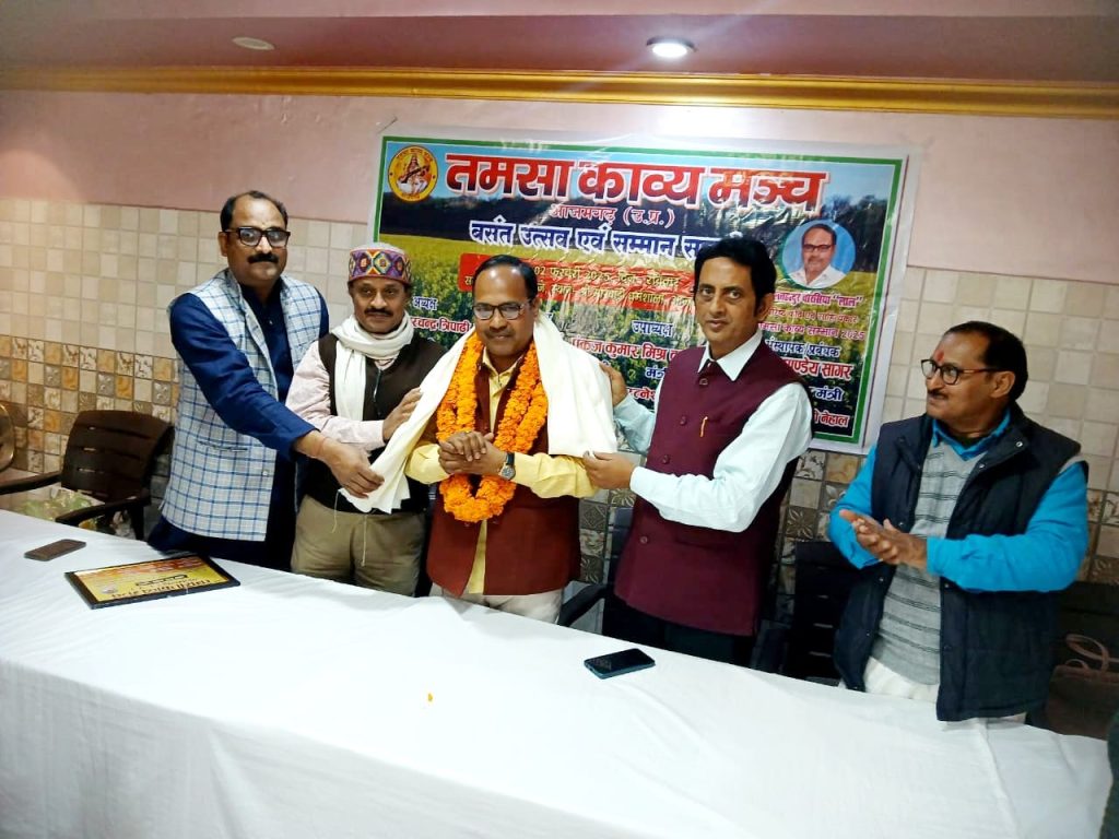 आजमगढ़। बसंत पंचमी के पावन अवसर पर आजमगढ़ की वृहद साहित्यिक संस्था तमसा काव्य मंच द्वारा मारवाड़ी धर्मशाला में बसंत उत्सव व सम्मान समारोह का आयोजन किया गया। कार्यक्रम की अध्यक्षता वरिष्ठ साहित्यकार श्री हरिहर पाठक जी, मुख्यअतिथि डॉ प्रवेश कुमार सिंह जी तथा कार्यक्रम संचालन शायर आदित्य आजमी ने किया। विशिष्ट अतिथि के रूप में श्री रुद्रनाथ चौबे रुद्र व श्री दिनेश दानिश जी उपस्थित रहे। वाग्देवी के पूजन अर्चन के साथ कार्यक्रम का शुभारंभ हुआ।