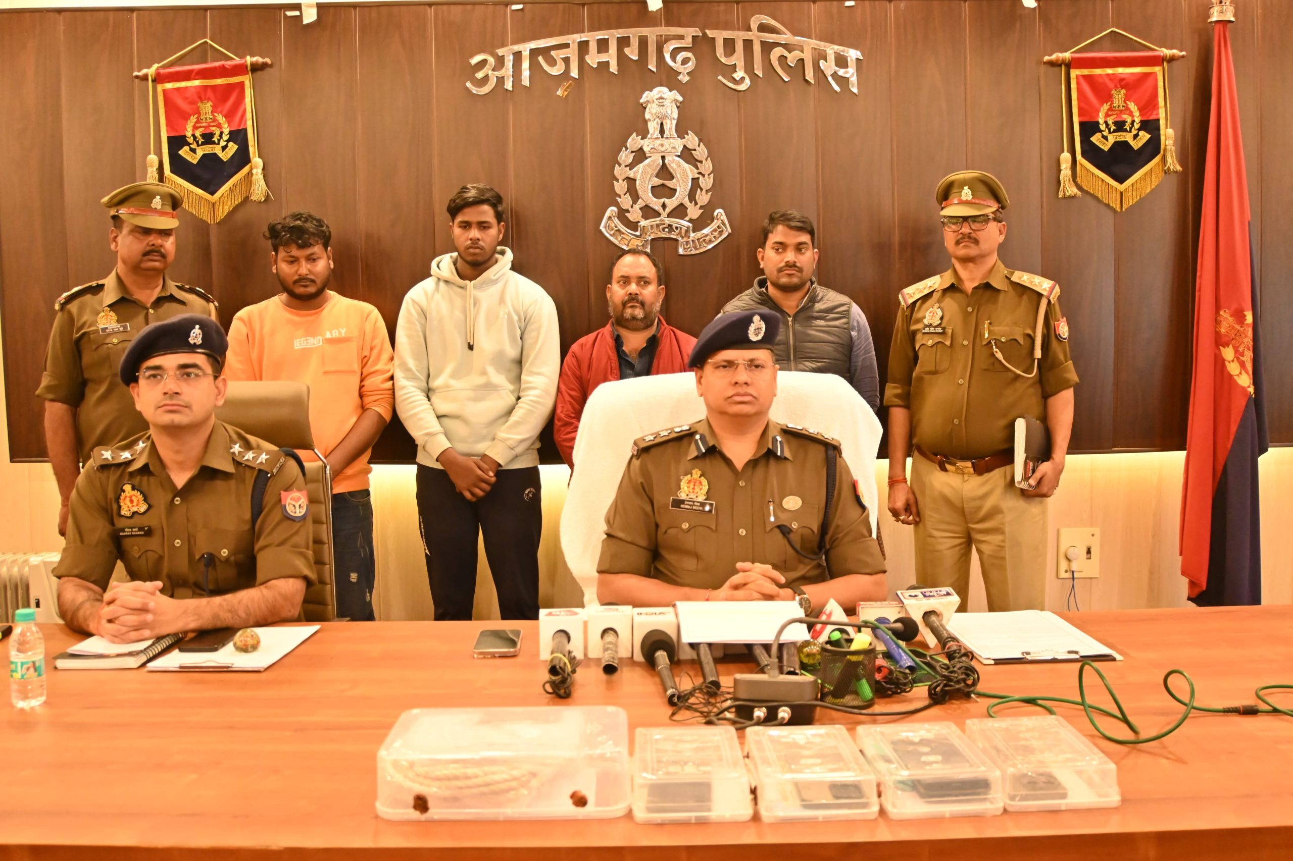 आजमगढ़ । शहर कोतवाली पुलिस ने हीरापट्टी के पास से पठखौली निवासी राजेश पाठक की हत्या के मामले का एसपी हेमराज मीणा ने पुलिस लाइन में खुलासा किया। प्रे स वार्ता में 4 लोगों को गिरफ्तार करने की जानकारी दी। चारों को मीडिया के समक्ष पेश किया गया। 33 वर्षीय रविंद्र सिंह उर्फ संतोष सिंह उर्फ़ साधू सिंह पुत्र वीर बहादुर सिंह निवासी लखुवा प्रधानपुर थाना रसड़ा जनपद बलिया हाल पता बिलरिया की चुंगी थाना कोतवाली आजमगढ़, 46 वर्षीय हरिकेश चौहान पुत्र सूर्यनाथ चौहान निवासी शेखपुरा थाना कोतवाली आजमगढ़, 20 वर्षीय मोहम्मद फैसल पुत्र अब्दुल मन्नान निवासी आर्य नगर थाना जीयनपुर व 22 वर्षीय विजय सिंह उर्फ बंटी पुत्र चंद्रभूषण सिंह निवासी खेमऊपुर थाना सिधारी को गिरफ्तार किया गया। एसपी ने बताया कि गिरफ्तार अभियुक्त रविन्द्र सिंह उर्फ संतोष सिंह उर्फ साधू सिंह ने पूछताछ पर बताया कि राजेशचन्द्र पाठक से मैंनें 15 लाख रूपये | उधार लिया था। और अपने साथी हरिकेश चौहान को भी 15 लाख रूपये उधार दिलवाया था। जिसका 1.5 लाख रूपये प्रतिमाह व्याज दिया करता था। इधर कुछ दिनों से व्याज न दे पाने के कारण राजेशचन्द्र पाठक मुझे व हरिकेश चौहान को पैसा वापस करने के लिए
