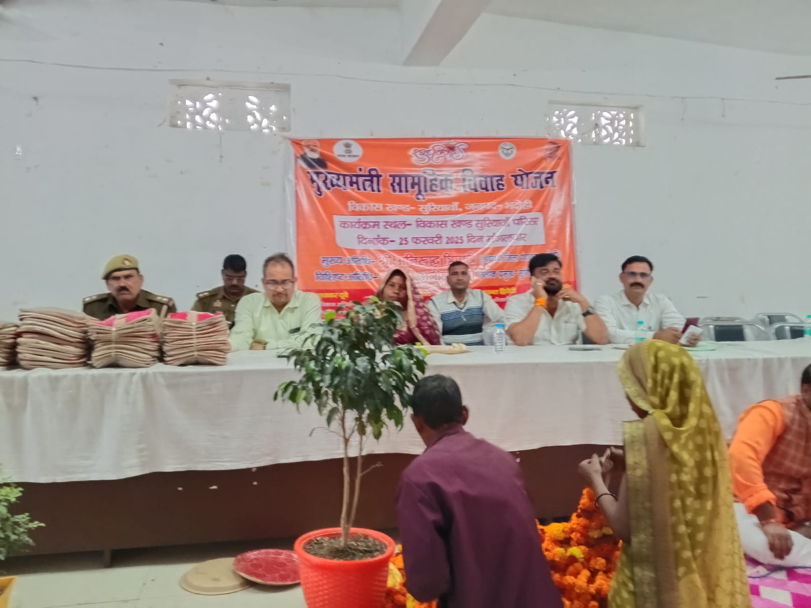 सुरियावां ( भदोही)। शासन के निर्देश पर चलाए जा रहे मुख्यमंत्री सामूहिक विवाह योजना के अंतर्गत मंगलवार को खंड विकास कार्यालय के सभागार में अतिथि जिला पंचायत सदस्य चंद्रभूषण तिवारी द्वारा बताया गया कि प्रदेश भर में पात्र गरीब कन्याओं के हाथ पीले करने के लिए उत्तर प्रदेश शासन की पुरजोर कोशिश जारी है जिसके अंतर्गत नगर एवं ग्रामीण क्षेत्र के गरीब पात्र व्यक्ति के पुत्री के लिए मुख्यमंत्री सामूहिक विवाह योजना वरदान साबित हो रहा है जिसके चलते पात्र व्यक्ति इसका भरपूर फायदा उठा रहे हैं इसी क्रम में भदोही जनपद के सुरियावा विकासखंड कार्यालय के सभागार में आज मंगल वार को 46 जोड़ों ने शादी के फेरे लेकर अग्नि को साक्षी मानकर एक साथ जिंदगी गुजारने की कसमें खाकर एक दूसरे के हुए। इस मौके पर वर पक्ष एवं वधू पक्ष से परिवार के लोग उपस्थित रहे ।इस मौके पर खंड विकास कार्यालय ज्ञानपुर से 15 जोड़ा जिसमें अनुसूचित 10 जोड़ा पिछड़ा वर्ग दो4जोड़ा तथा नगर पालिका सुरियावा 2 अनुसूचित से जोड़ा विकास कार्यालय अभोली से 6 अनुसूचित जाति पिछड़ा वर्ग 9 खंड विकास कार्यालय सुरियावा से अनुसूचित जाति 11 जोड़ा पिछड़ा वर्ग 3 जोड़ा की शादी संपन्न हुई मुख्यमंत्री सामूहिक विवाह योजना के अंतर्गत शासन की तरफ से वर एवं वधू के खाते में 35000 रुपए नगद तथा साड़ी चार जोड़ा ब्लाउज पेटिकोट चुनरी पेट का कपड़ा शर्ट का कपड़ा पगड़ी फत चांदी की बिछिया 10 ग्राम पायल 30 ग्राम स्टील डिनर सेट प्रेशर कुकर ट्रॉली बैग ब्रांडेड वैनिटी किट टी दीवाल घड़ी तथा ₹6000 मंडप खाना शादी सहित अन्य खर्च के लिए दिया जाता है इस मौके पर ब्लॉक प्रमुख सुरियावा अनिता गौतम द्वारा वर एवं वधू को आशीर्वाद प्रदान कर उनके उज्जवल भविष्य की कामना करते हुए आशीर्वाद प्रदान किया तथा सुरक्षा की दृष्टि से सुरियावा थाने की फोर्स थाना अध्यक्ष सुरियावा अजीत श्रीवास्तव के नेतृत्व में महिला एवं पुरुष कांस्टेबल लगातार चक्रमण करते रहे तथा पुरोहित नवीन कुमार द्वारा विवाहकार्यक्रम को संपन्न कराया गया इसमौके पर खंड विकास अधिकारी सुरियावां सुधाकर दुबे खंड विकास अधिकारी ज्ञानपुर ग्राम पंचायत अधिकारी राजनाथ नगर पंचायत सुरियावा से कर्मचारी, ब्लॉक कर्मचारी तथा बर् एवं वधू पक्ष के लोग लोग उपस्थित रहे।