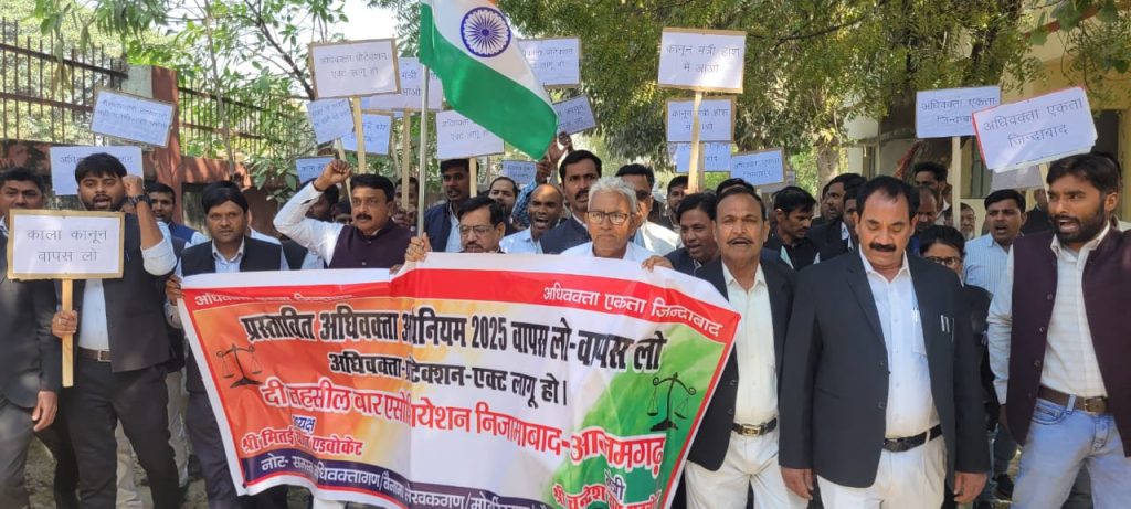 दी तहसील बार एसोसिएशन निजामाबाद के अधिवक्ता मंगलवार को आंदोलन पर रहे।अधिवक्ताओं ने पुस्तकालय सभागार में साधारण सभा की बैठक की। जिसमें सरकार द्वारा पारित अधिवक्ता अधिनियम 1961 में संशोधन बिल 2025 का अधिवक्ताओं ने विरोध जताया। बैठक को संबोधित करते हुए वरिष्ठ अधिवक्ता सत्येन्द्र नाथ राय ने कहा की यह काला कानून अधिवक्ता और बादकारी दोनों के हित में नहीं है। उन्होंने ने कहा कि इस काले कानून के वापस होने तक हमारा संघर्ष जारी रहेगा। बैठक में कानून वापस होने तक अदालतों के बहिष्कार कर धरना प्रदर्शन का निर्णय लिया गया। तत्पश्चात अधिवक्ता एक जुट होकर नारेबाजी करते हुए अम्बेडकर प्रतिमा तक विरोध प्रदर्शन किया। तथा अपने मांगों के समर्थन में नारे लगाए। अधिवक्ताओं के विरोध प्रदर्शन के चलते न्यायालयो में काम काज प्रभावित रहा।