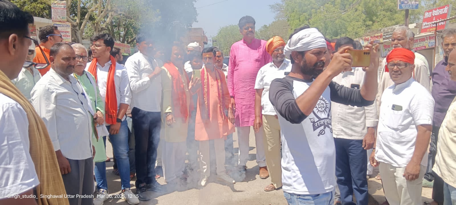 इस मौके पर संबोधित करते हुए सिंगरामऊ राजघराने के कुंवर मृगेंद्र सिंह ने कहा कि जिनका इस देश में कोई बलिदान नहीं रहा, नहीं कोई योगदान रहा वह भी हमारे पूर्वजों, हमारे बलिदानियों पर जब मन करता है प्रश्न उठा देते हैं.? इस तरीके का चलन तभी बंद होगा जब तक ऐसे लोगों पर कड़ी कार्रवाई नहीं की जाएगी। उन्होंने कहा कि राज्यसभा से लाल सुमन की संसद सदस्यता समाप्त की जानी चाहिए और उसके ऊपर एफआईआर दर्ज होनी चाहिए । अखिलेश यादव को इत्र से प्यार है , गोमूत्र से बदबू आती है, ईद मनाते हैं होली दीपावली में पर्यावरण को बचाते हैं, बाबर इनका प्यारा है। राणा सांगा गद्दार नज़र आते हैं। ऐसे लोग 2027 में क्या कभी सत्ता में नहीं आ सकते जातियों में बांटकर राज करना चाहते हैं लेकिन अब जनता इनकी हकीकत जान चुकी है।इस मौके पर क्षत्रिय चेतना मंच के वरुण सिंह, सिंगरामऊ राजघराने के कुंवर मृगेंद्र सिंह शिव बाबा, ज्ञानेंद्र सिंह, सैकड़ो की संख्या में लोग मौजूद रहे।