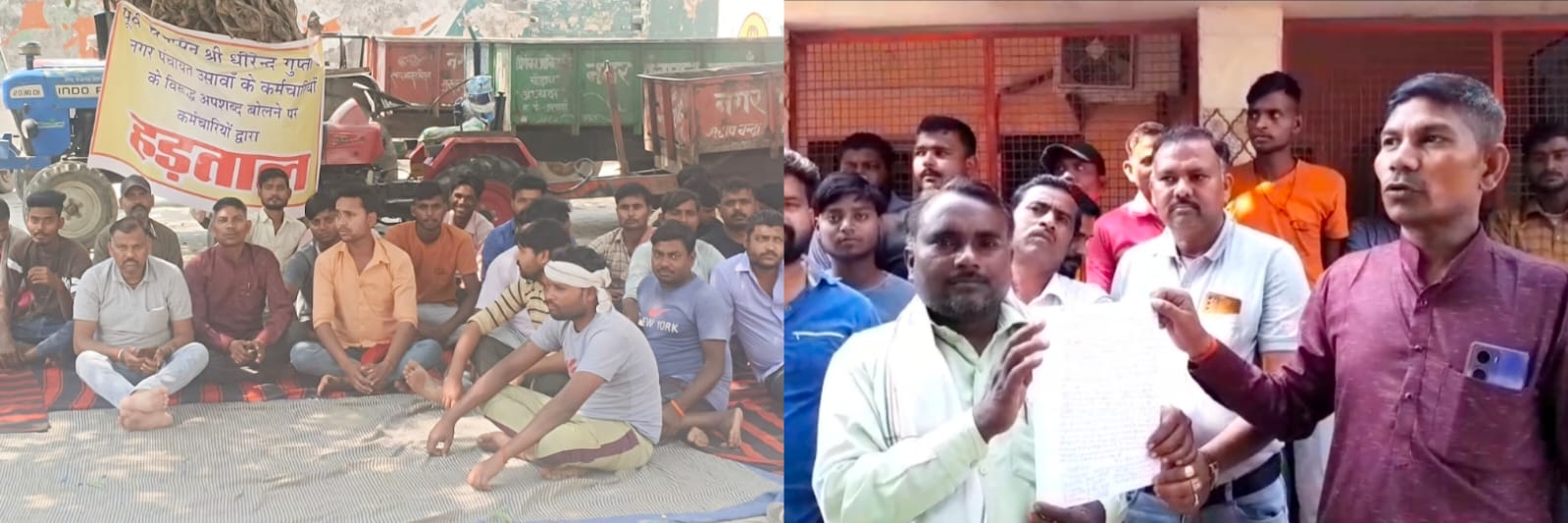 नगर पंचायत कर्मचारी बैठे धरने पर।