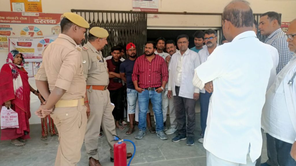 फायर ब्रिगेड के लीडिंग फायर मैन कमलेश कुमार सिंह के द्वारा चिकित्सकों और स्वास्थ्य कर्मियों को अग्नि शमन यंत्र की दी गई जानकारी।