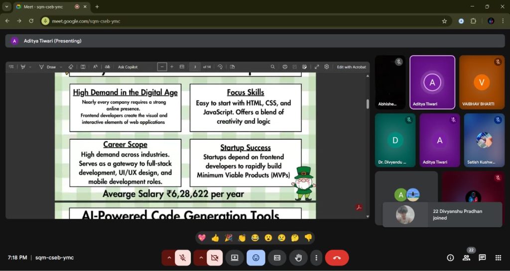 सेशन में विषय विशेषज्ञ और आई ट्रिपल ई ब्रांच चेयर आदित्य तिवारी ने वेब डेवलेपमेंट की बारीकियों, तकनीकी टूल्स तथा AI एकीकरण की आधुनिक विधियों पर विस्तृत जानकारी दी। उन्होंने छात्रों को प्रोजेक्ट आधारित लर्निंग के महत्व और इंडस्ट्री डिमांड के अनुरूप कौशल विकसित करने के सुझाव दिए।