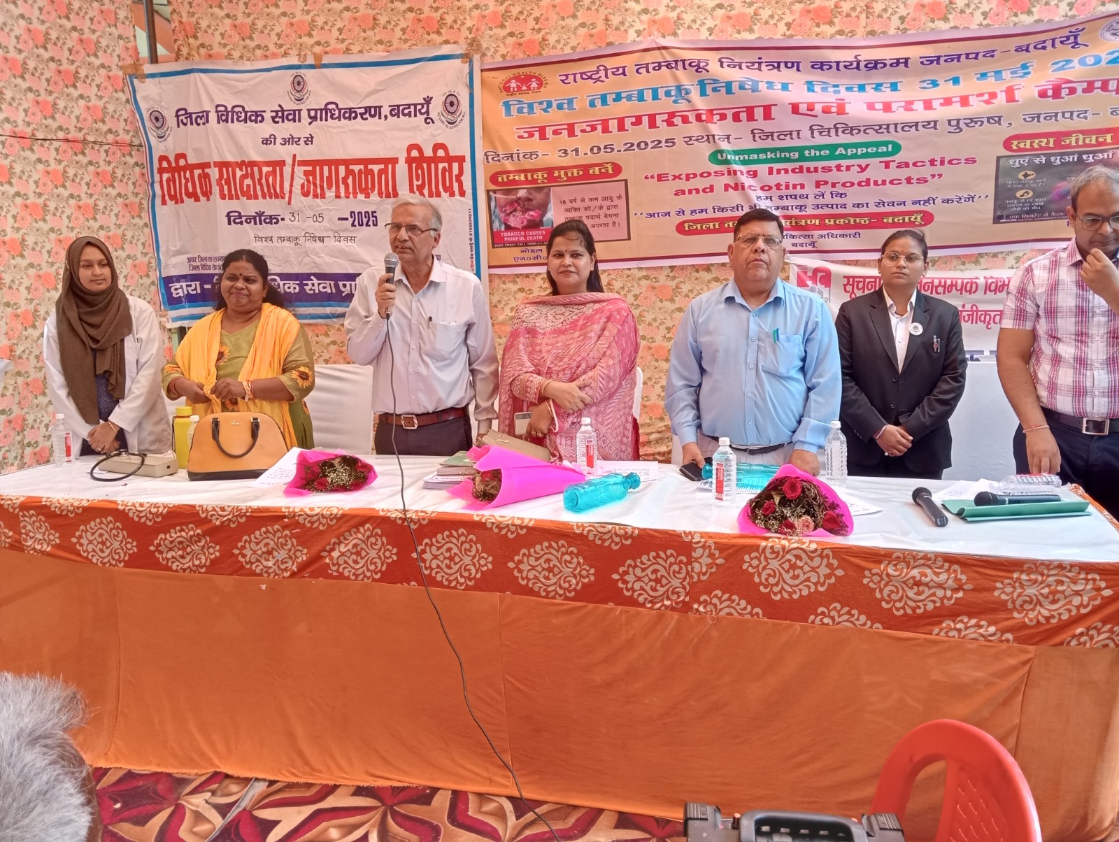 बदायूँ। उ०प्र० राज्य विधिक सेवा प्राधिकरण, लखनऊ के निर्देशानुसार जनपद न्यायाधीश/ अध्यक्ष, जिला विधिक सेवा प्राधिकरण, बदायूं के निर्देशानुपालन में सचिव, जिला विधिक सेवा प्राधिकरण, बदायूं द्वारा शनिवार को जिला पुरूष चिकित्सालय, बदायूं में विश्व तम्बाकू निषेध दिवस के अवसर पर जागरूकता शिविर का आयोजन किया गया।