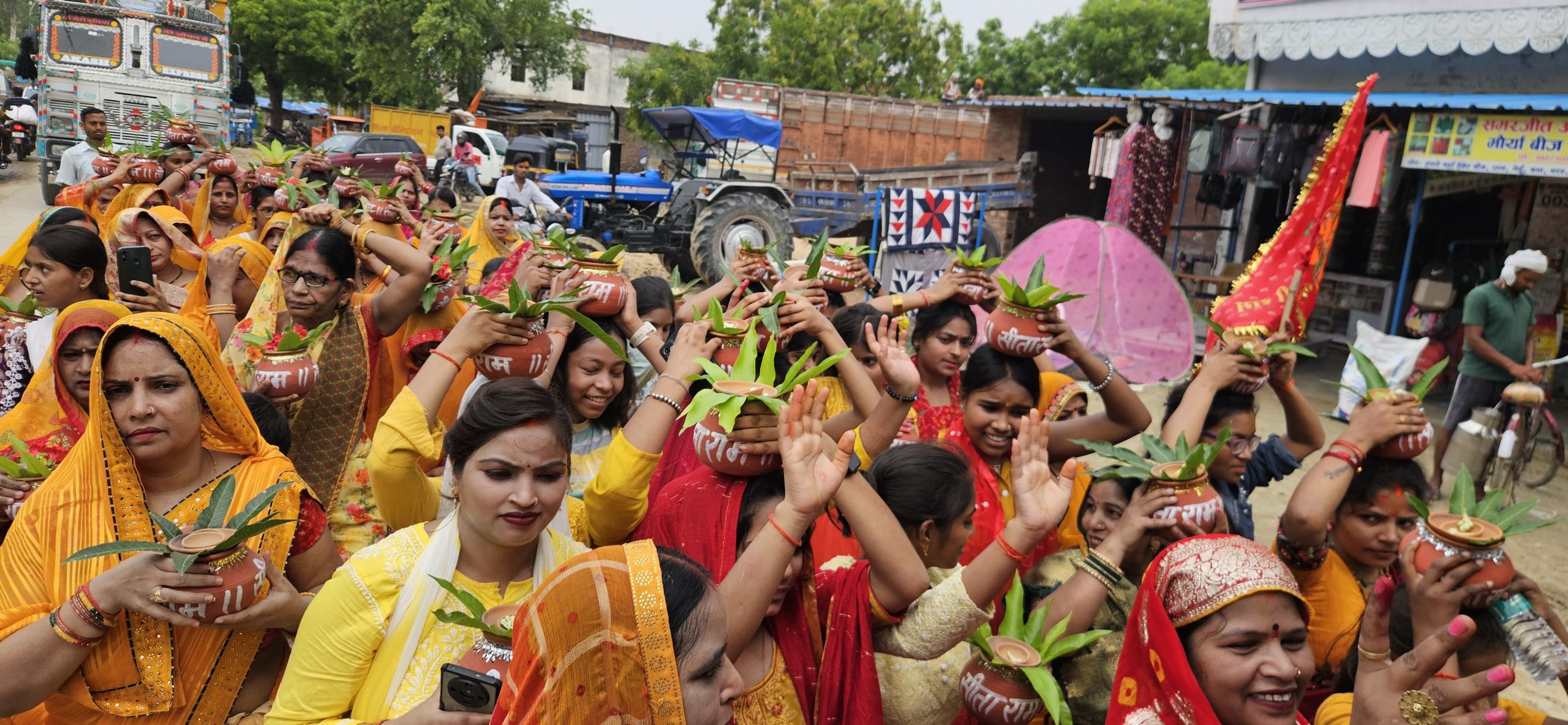 गाजे बाजे के साथ निकली श्री राम कथा यज्ञ के दौरान कलश यात्रा।